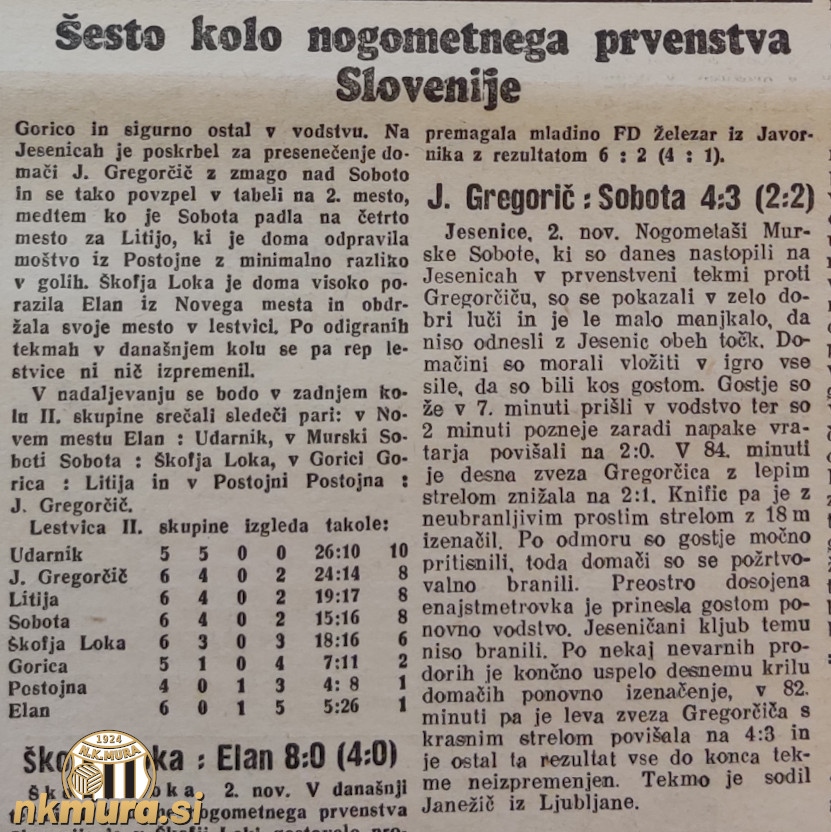 Sobota se je prikazala v zelo dobri luči in le malo je manjkalo, da ni iz Jesenic odnesla obeh točk. Naši nogometaši so prišli v vodstvo v 7. minuti, dve minuti pozneje pa so že vodili z 0:2. V prvem polčasu je nato desna zveza Gregorčiča izid znižala na 1:2, nato pa je Knific izenačil iz prostega strela.