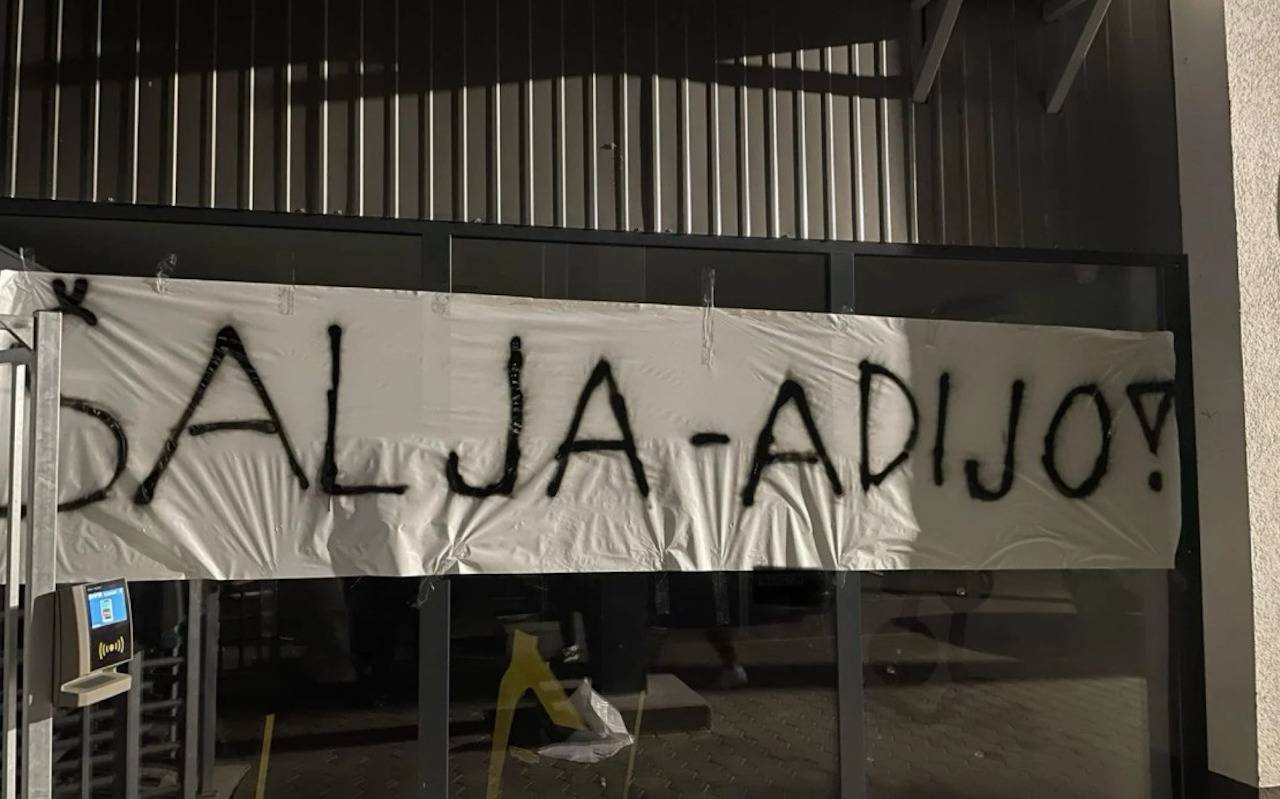 Transparent namenjen generalnemu direktorju Agronu Šalji. Izobešen je bil 30. novembra 2024. Avtorske pravice: nkmura.si Foto: svetovni splet