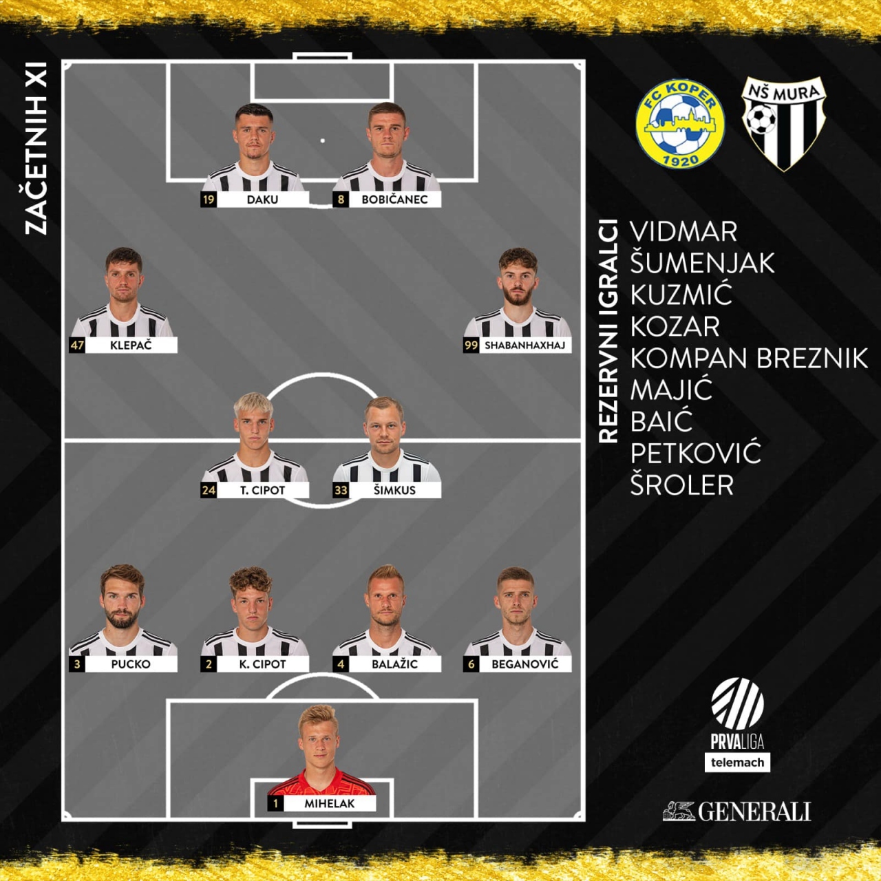 Mura: Mihelak, Beganović, Balažic, Pucko (od 65. Kuzmič), Shabanhaxhaj (od 76. petković), Šimkus (od 85. Kozar), Bobičanec, Klepač (od 76. Šroler), K. Cipot, Daku, T. Cipot. Trener: Damir Čontala.