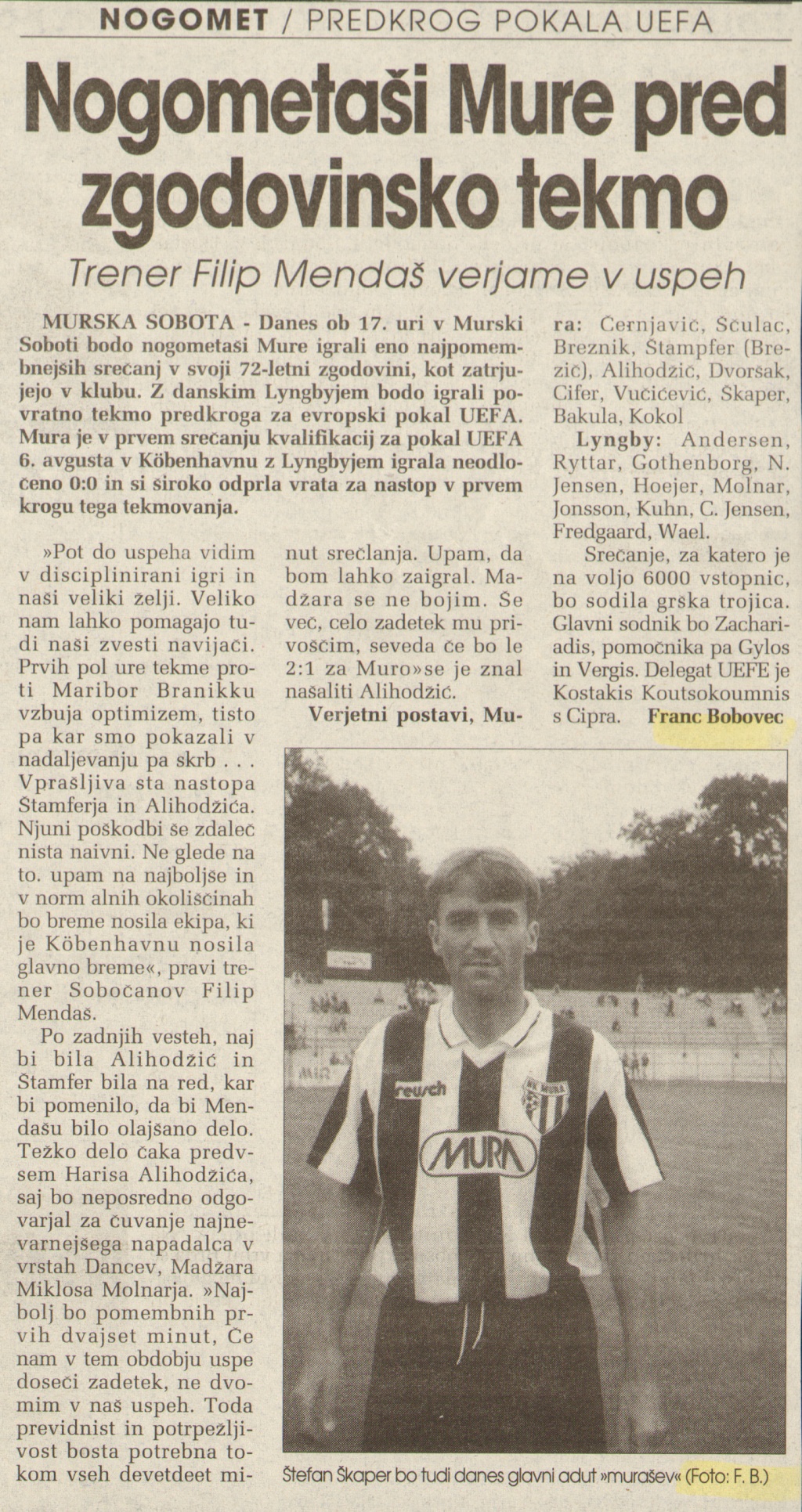 Nogometaše Mure čaka danes povratna tekma 2. predkroga kvalifikacij za pokal UEFA. Trener Filip Mendaš verjame v uspeh svoje ekipe. Nekoliko vprašljiva sta nastopa Stampferja in Alihodžića, ki se ubadata s poškodbo.