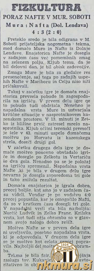 Nogometaši Mure so se v prijateljski nogometni tekmi pomerili z lendavsko Nafto in zmagali s 4:3 (2:0). Zmaga Mure je zaslužena in na nek način presenečenje, kajti Nafta je v zadnjem času nanizala nekaj dobrih rezultatov. Uspešno je namreč igrala v pokalu Osvobodilne fronte.