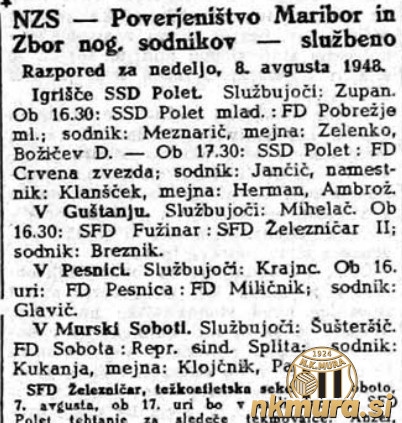 Nogometaši Sobote so se v nedeljo, 8. avgusta 1948, v pripravah na prvenstvo v sezoni 1948/49 pomerili z sindikalno reprezentanco Splita. Naši nogometaši so slavili s 5:1. Sodil je Vladimir Kukanja, pomagala pa sta mu Klojčnik in Papič.