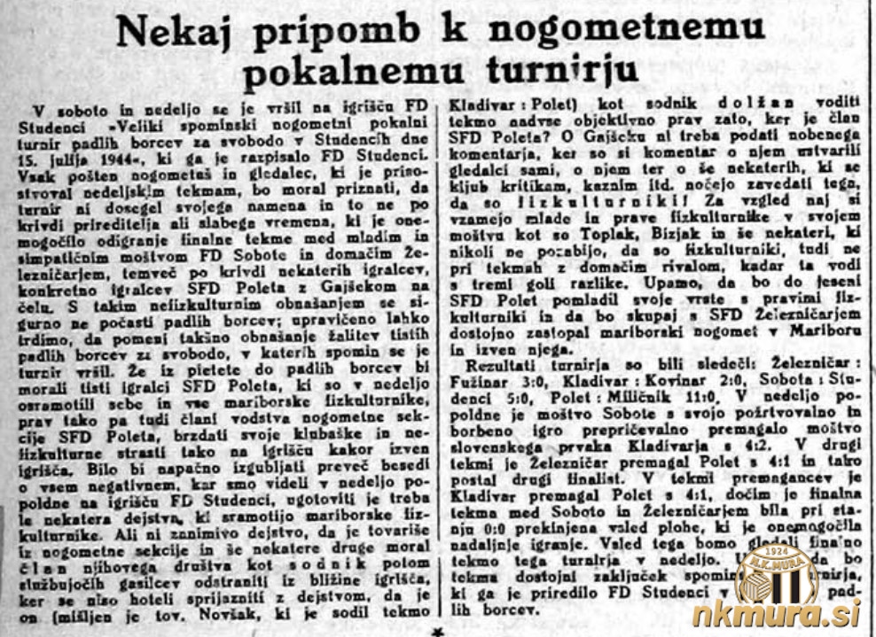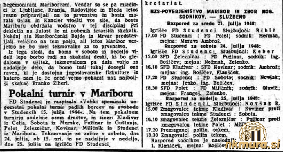 V soboto 24. in nedeljo 25. julija 1948 se je v Mariboru vršil nogometni turnir v spomin na padle borce za svobodo. Zraven Sobote so na turnirju sodelovali še Kladivar Celje, Fužinar, Polet, Železničar Maribor, Kovinar Maribor, Miličnik Maribor in Studenci Maribor.