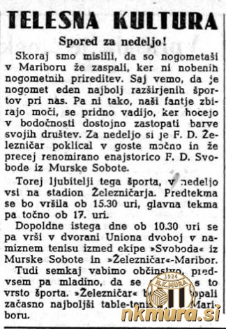 Nogometaši Svobode so gostovali v Mariboru in se pomerili z Železničarjem. Sobočani so bili boljši z 0:1, končni rezultat pa je bil dosežen že v prvem polčasu.