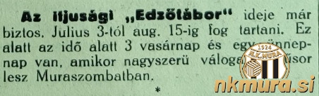 Nogometni tabor za mlade nogometaše se bo pričel 3. julija 1944. Udeležilo se ga bo od 70 do 80 mladih igralcev, ki bodo pod strokovnim očesom usposobljenih trenerjev trenirali dva tedna.