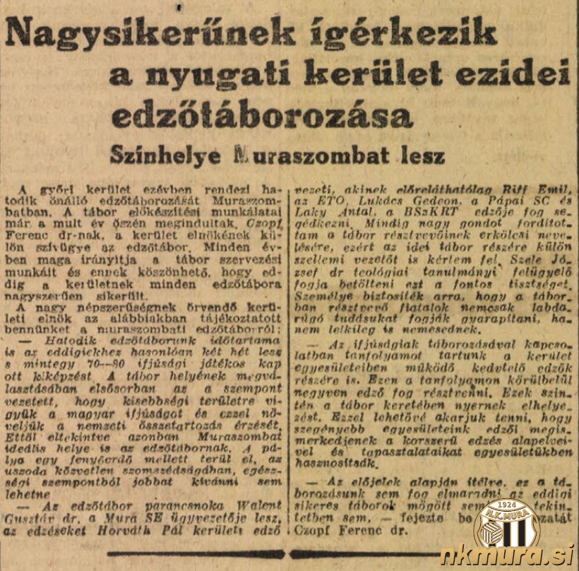 Vodja tabora bo izvršni predsednik Mure dr. Gusztav Valent, treninge pa bodo vodili Pál Horváth, Emil Riff (ETO), Gedeon Lukács (Papai SC) in Antal Laky (BSzKRT). Letošnji tabor bo imel še duhovnega voditelja, ki bo skrbel za osebnostno vzgojo mladih nogometašev.