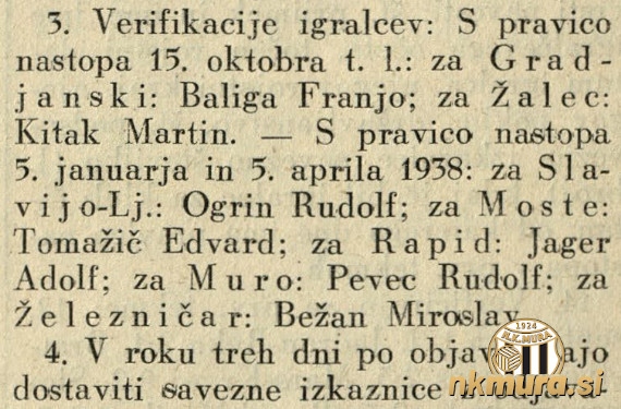 Po številnih odhodih je Mura dobila novega igralca, to je Rudolf Pevec. Verificiran je bil 5. oktobra 1937, pravico nastopa pa ima od 5. aprila 1938 dalje.