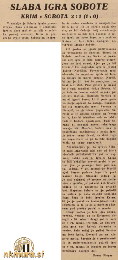 Začetek tekme je nakazal, da Krim ne namerava prepustiti točk Soboti. Domače moštvo je že od začetka pričelo diktirati tempo, vratar Morčič pa je moral nekajkrat posredovati. Sobota je šele v 18. minuti ogrozila domača vrata. Rahla terenska premoč je Krimu v 25. minuti prinesla zadetek. Igralec Krima je prejel žogo na šestnajstih metrih od gola in jo z močnim strelom pod prečko poslal v mrežo. Drugi polčas je bila tekma nekoliko bolj enakovredna, vendar pa so Krimovci 50. in nato še v 70. minuti dosegli drugi in tretji zadetek. Za oba prejeta gola nosijo največjo krivdo obrambni igralci in vratar. V 80. minuti je Maučec po lepem predložku dosegel častni zadetek.