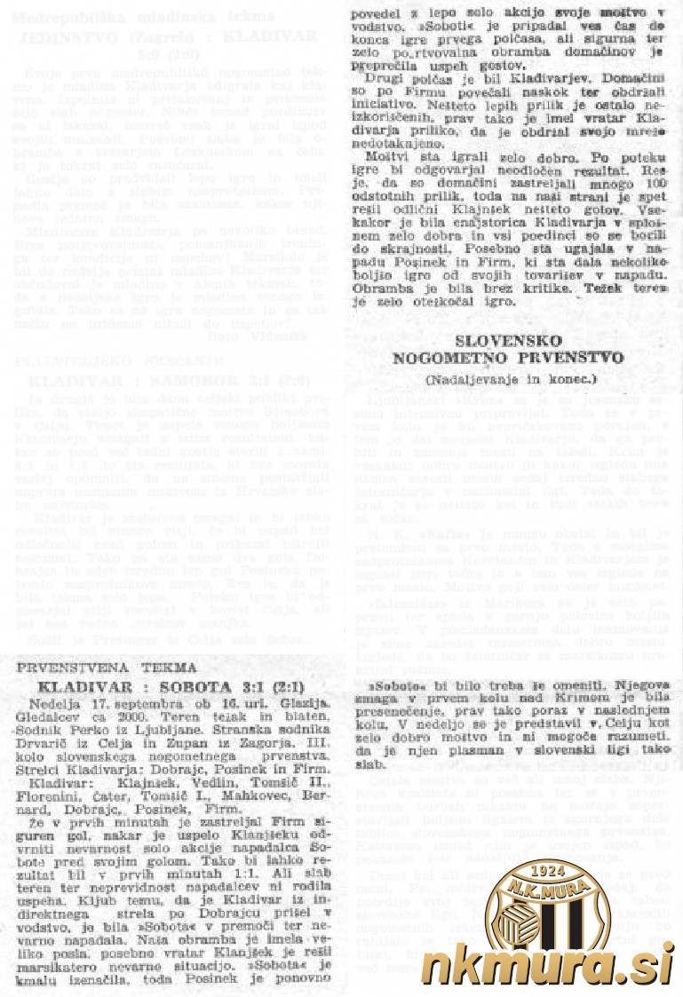 Prvi so zapretili domačini, ko je lepo priložnost zapravil Firm. Že v naslednjem napadu je imela lepo priložnost tudi Sobota in namesto, da bi bilo 1:1 je ostalo pri začetnih 0:0. Kladivar je povedel s strelom Dobrajca iz prostega strela. Po zadetku je bila Sobota v premoči ter nevarno napadala. Z obrambami se je izkazal vrtar Klajnšek, ki je obranil nekaj nevarnih situacij. Kmalu zatem je Sobota izenačila, vendar je Prosinek domačine znova povedel v vodstvo z 2:1. Sobota si je nato prizadevala izid izenačiti, vendar ji to ni uspelo. Drugi polčas je pripadel Kladivarju, Firm pa je povečal vodstvo na 3:1.