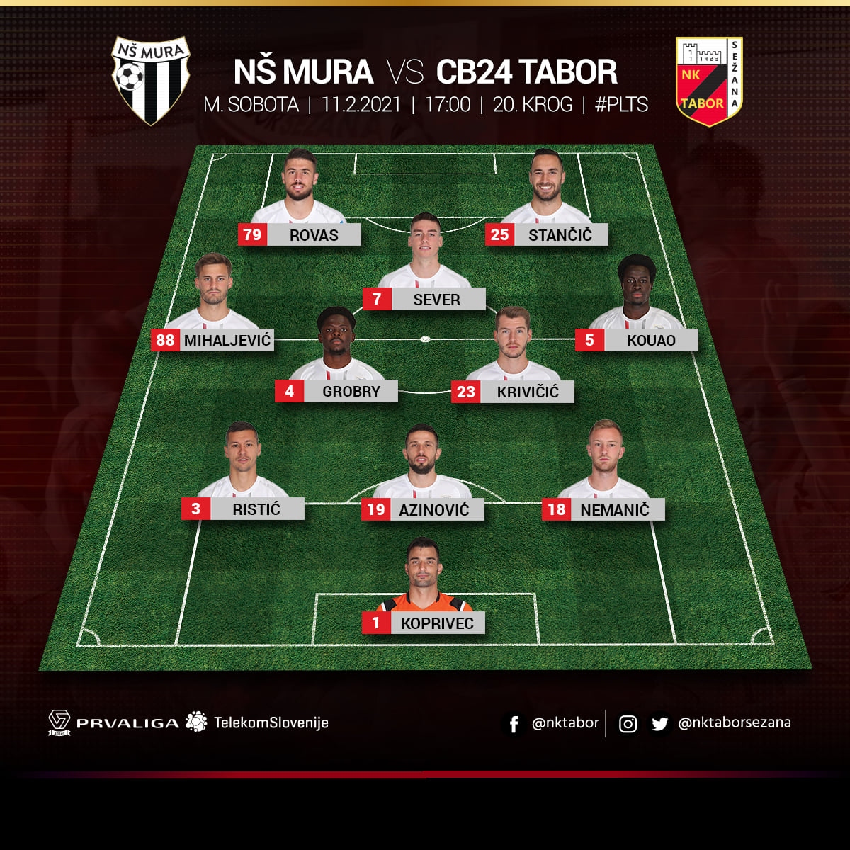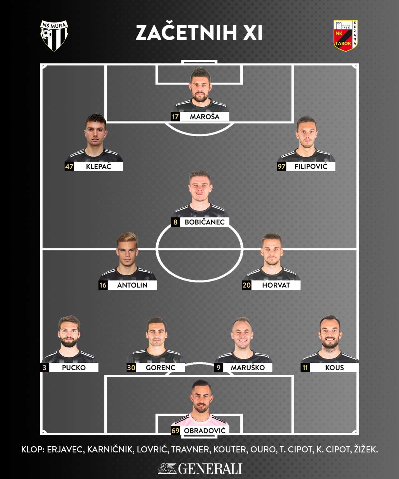Ante Šimundža je, tako kot smo pričakovali, na zelenico poslal enako enajsterico, ki je pred nekaj dnevi igrala generalko s Celjem. Svoj debi je dočakal Aljaž Antolin, na klopi pa je prvič sedel tudi vratar Lan Erjavec. V drugem polčasu so priložnost med drugim dobili še igralci, ki so zadnje dni preživeli v karanteni - Žan Karničnik, Nino Kouter in Tio Cipot. Mura je igrala s štirimi v zadnji vrsti, torej enak sistem kot v Celju.