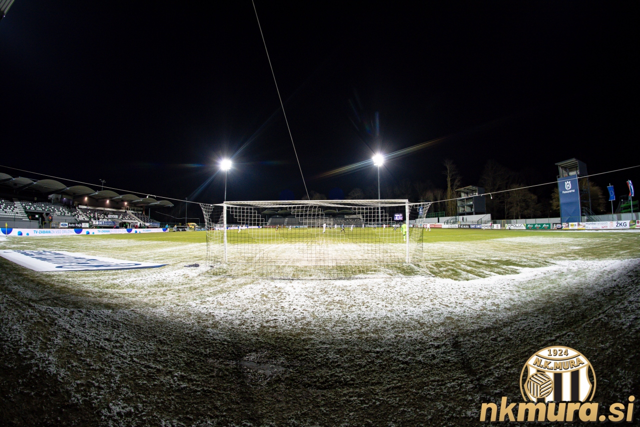 Razmere za igro niso bile najboljše, saj je bila zelenica delno pokrita s snegom, pihal je severni veter, temperatura pa se je spustila pod ledišče. Kljub temu je Mura v prvem polčasu prevladovala in imela žogo več v svojih nogah. Na prvo priložnost je bilo potrebno počakati do 21. minute, ko je z roba kazenskega prostora streljal Luka Bobičanec, vendar je meril visoko prek vrat. Nekaj minut kasneje je vratar gostov strel Mihaela Klepača brez težav ukrotil. Najlepšo priložnost v prvem delu je Mura zapravila v 35. minuti, ko je Mihael Klepač močno streljal z desne strani, njegov strel pa je vratar gostov s težavo odbil v kot. Gostje so v prvem polčasu le enkrat streljali na vrata Mure.