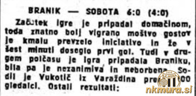 Začetek tekme je pripadel domačinom, toda kmalu je veliko bolj uigrano moštvo Branika prevzelo pobudo in povedlo že v 6. minuti. Tudi v drugem polčasu je igra pripadla Braniku, bila pa je nezanimiva in neborbena. Pred 1200 gledalci je sodil Vukotić iz Varaždina.