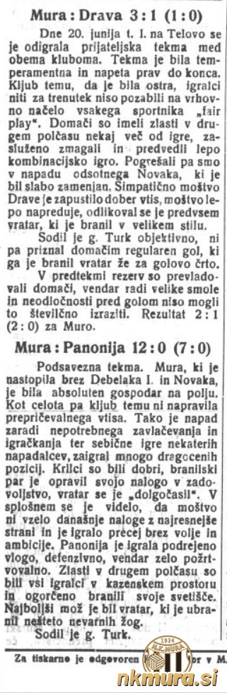 V prijateljski nogometni tekmi se je Mura pomerila z mestnim tekmecem Panonijo in zmagala z 12:0. Ob polčasu je bilo 7:0. Tekma je bila odigrana v korist podzvezne blagajne. Na ta dan so namreč bili na področju Dravske banovine odigrani številni mestni derbiji. Med drugim so se pomerili Primorje : Ilirija, Drava : Ptuj, na Jesenicah Bratstvo in Gorenjec itd.