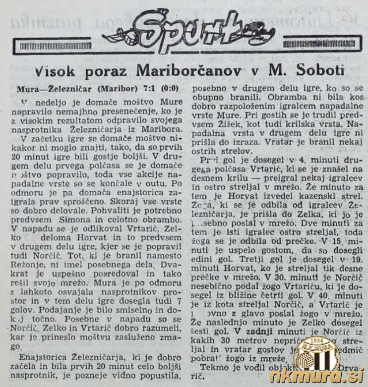 Nogometaši Mure so v tretjem krogu prvenstva gostili mariborski Železničar in dosegli visoko zmago 7:1. Vsi zadetki so bili doseženi v drugem polčasu.