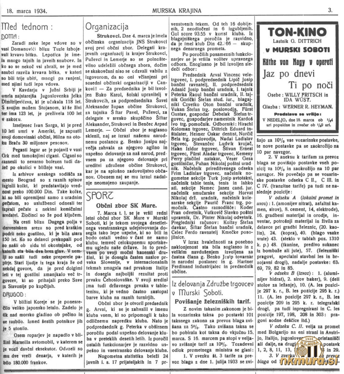 7. marca 1934 je bil ob 20.00 v posebni sobi gostilne Turk občni zbor SK Mure. Za predsednika kluba je bil znova izvoljen Vincenc Arvai. Prvič je klub dobil dva podpredsednika, to sta postala Josip Lipič in Josip Adanič. Člani kluba so za častna člana izvolili Josipa Benka in Ferdinanda Hartnerja.
