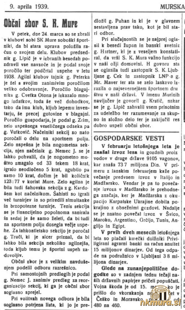 V petek, 24. marca 1939, je bil ob 8.00 zvečer, v gostilni Banfi redni letni občni zbor Mure. Predsednik je znova postal Josip Lipič, podpredsednika Slavko Vutković in Koloman Hirschl, tajnik pa Raoul Peterka.