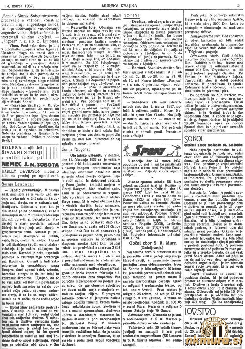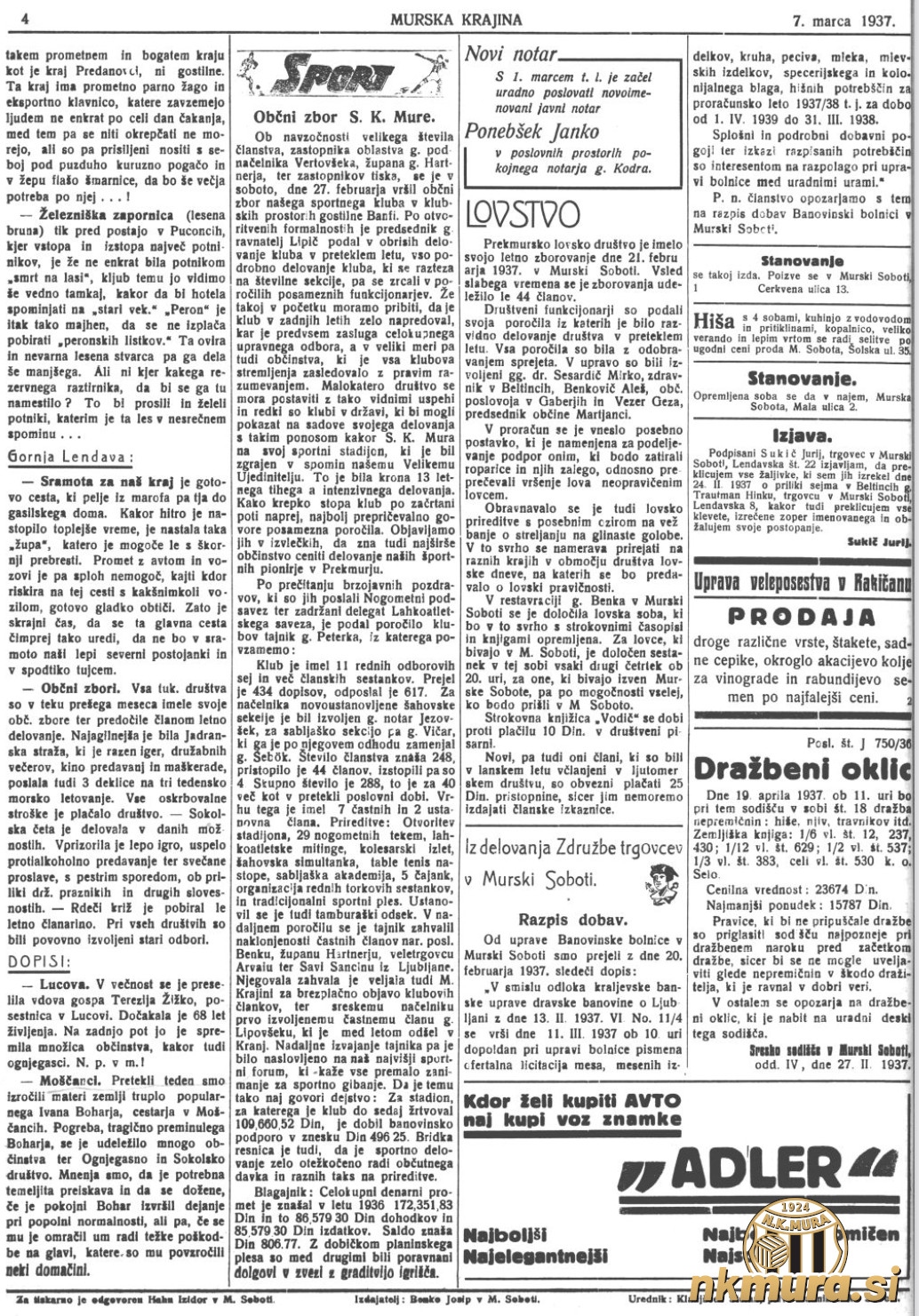 27. februarja 1937 je bil v prostorih gostilne Banfi občni zbor SK Mure, na katerem so člani potrdili nov mandat dosedanjemu predsedniku Josipu Lipiču. Podpredsednika še vedno ostajata Slavko Vutković in Koloman Hirschl.