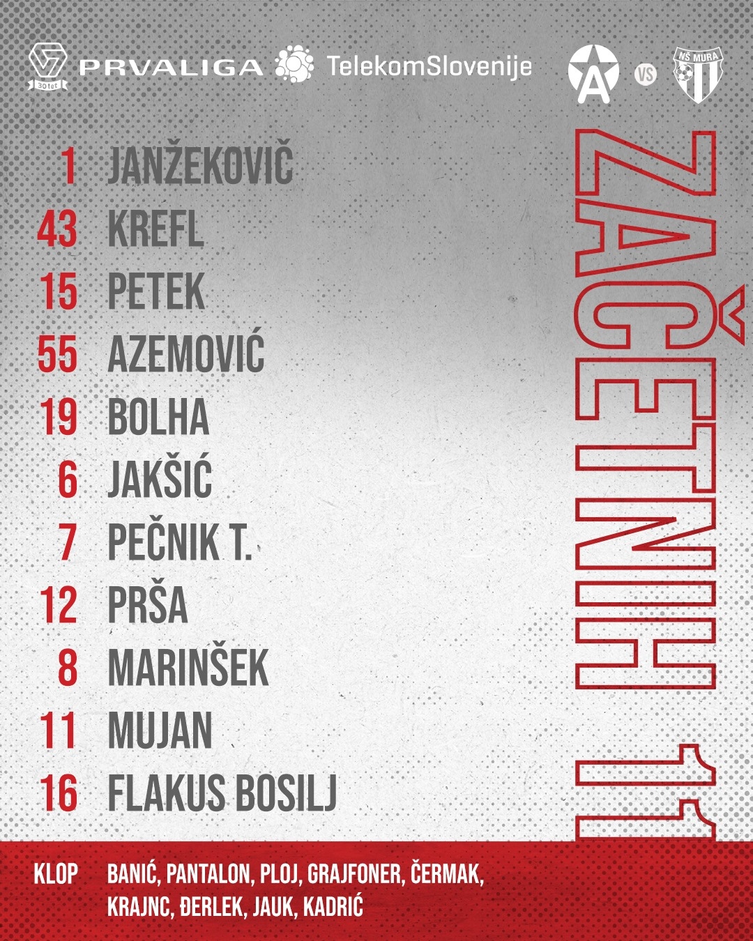 Danes je Mura na desnem boku pogrešala kaznovanega Žigo Kousa, ki ga je na njegovem mestu zamenjal Pucko. V napadu je priložnost pred Kaijem Cipotom dobil Žižek. Na klop za rezervne igralce se je po poškodbi vrnil Marko Brkić, pogrešali pa smo Klepača in Lovrića.