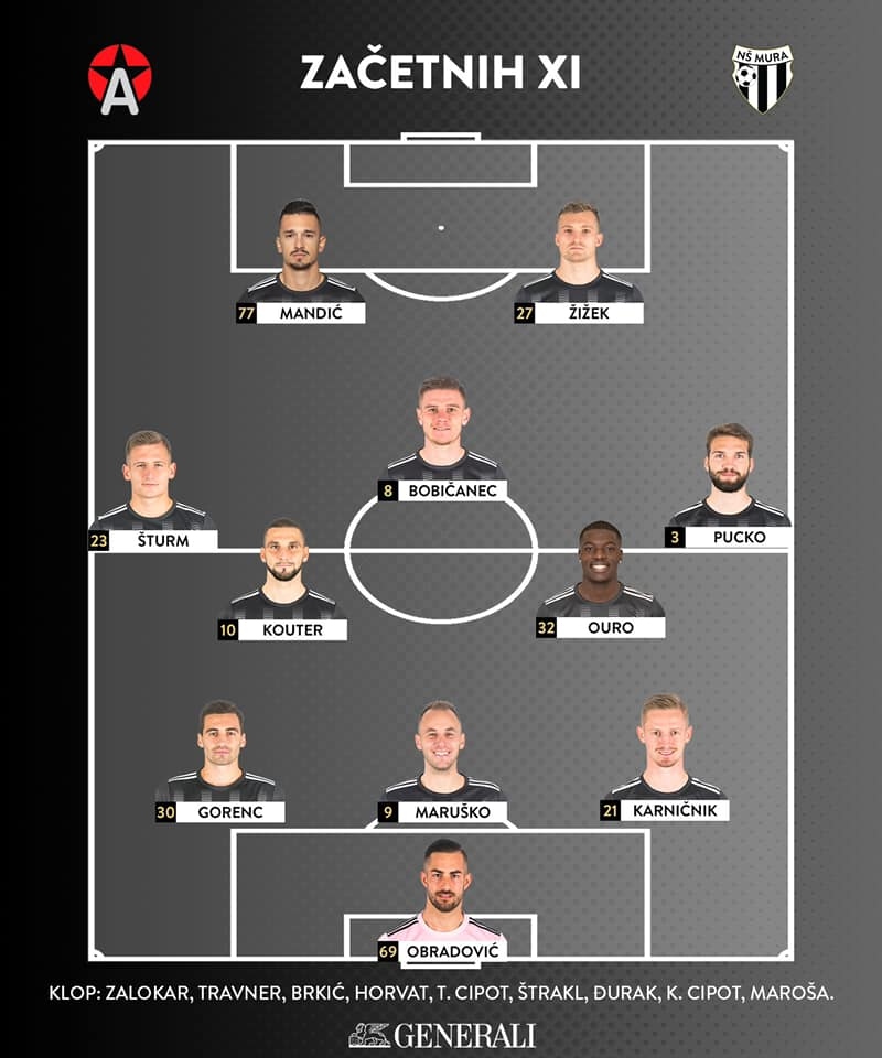 Ante Šimundža je na igrišče poslal pričakovano enajsterico: Obradović - Gorenc, Maruško, Karničnik - Šturm, Kouter, Bobičanec, Ouro, Pucko (od 84. Đurak) - Mandić (od 72. Horvat) in Žižek (od 72. K. Cipot).