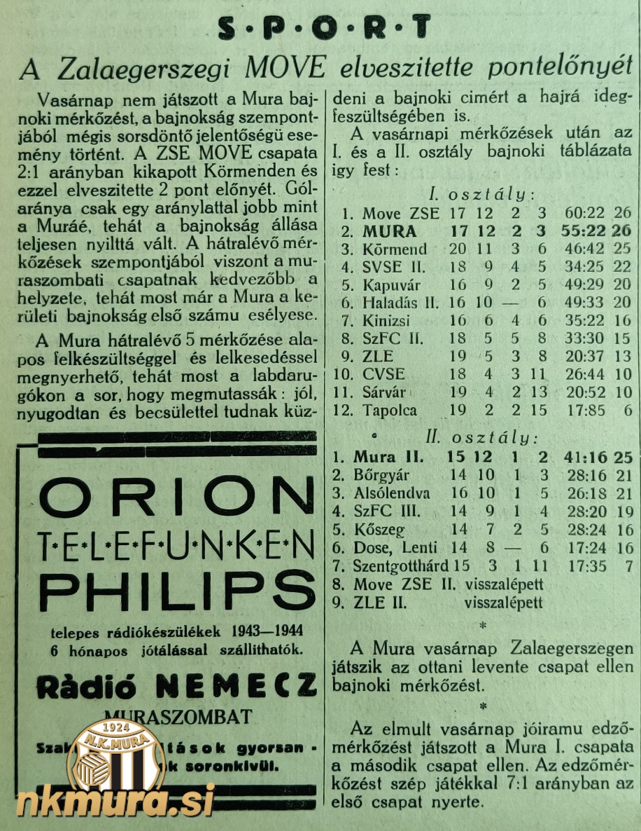 Nogometaši Mure so ta vikend počivali in niso igrali prvenstvene tekme. Jo je pa igral njihov največji tekmec v boju za prvo mesto Zalaegerszeg, ki je proti Körmendu izgubil z 2:1. Pet krogov pred koncem sta obe ekipi točkovno poravnani, zato se obeta hud boj v boju za naslov prvaka.