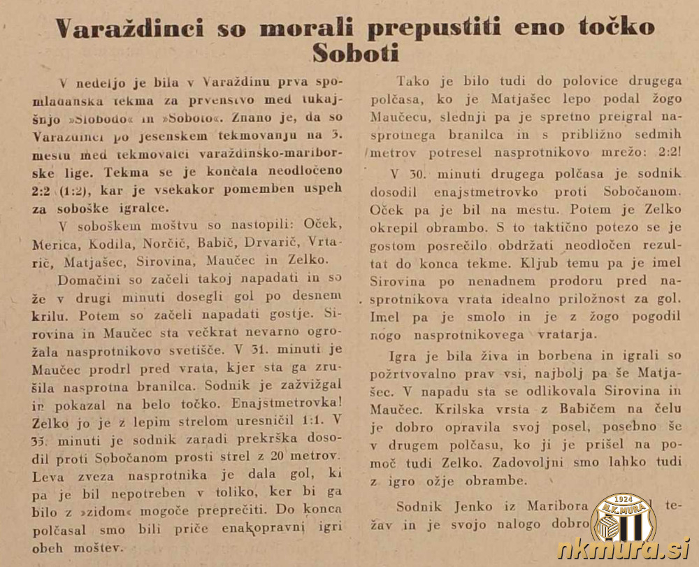 Nogometaši Sobote so se v prvi tekmi spomladanskega kroga M-V-C lige odpravili v Varaždin, kjer so se pomerili s Slobodo, ki je jesenski del končala na tretjem mestu. Tekma se je končala brez zmagovalca 2:2 (2:1).