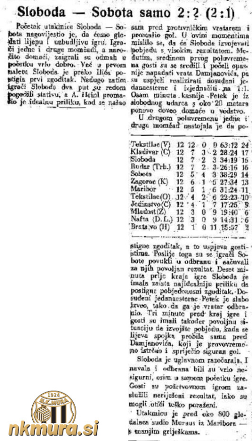 Tekmo so bolje pričeli domačini, ki so že v drugi minuti zatresli mrežo Oučeka. Uspešen je bil Ilić. Igralci Slobode so nadaljevali z napadi in še dvakrat stresli okvir vrat. Po začetnem naletu domalčinov so z napadi pričeli tudi naši nogometaši, najbolj nevarna pa sta bila Maučec in Sirovina. V 31. minuti je Maučec prodrl proti vratom, kjer sta ga zrušila dva branilca Slobode. Glavni sodnik Jenko iz Maribora je pokazal na belo točko. Uspešen izvajalec je bil Zelko. V 33. minuti so domačini izvajali prosti strel z dvajsetih metrov. Nekoliko slabše postavljanje živega zidu je Slobodi omogočilo vodstvo z 2:1. Strelec je bil Petek.