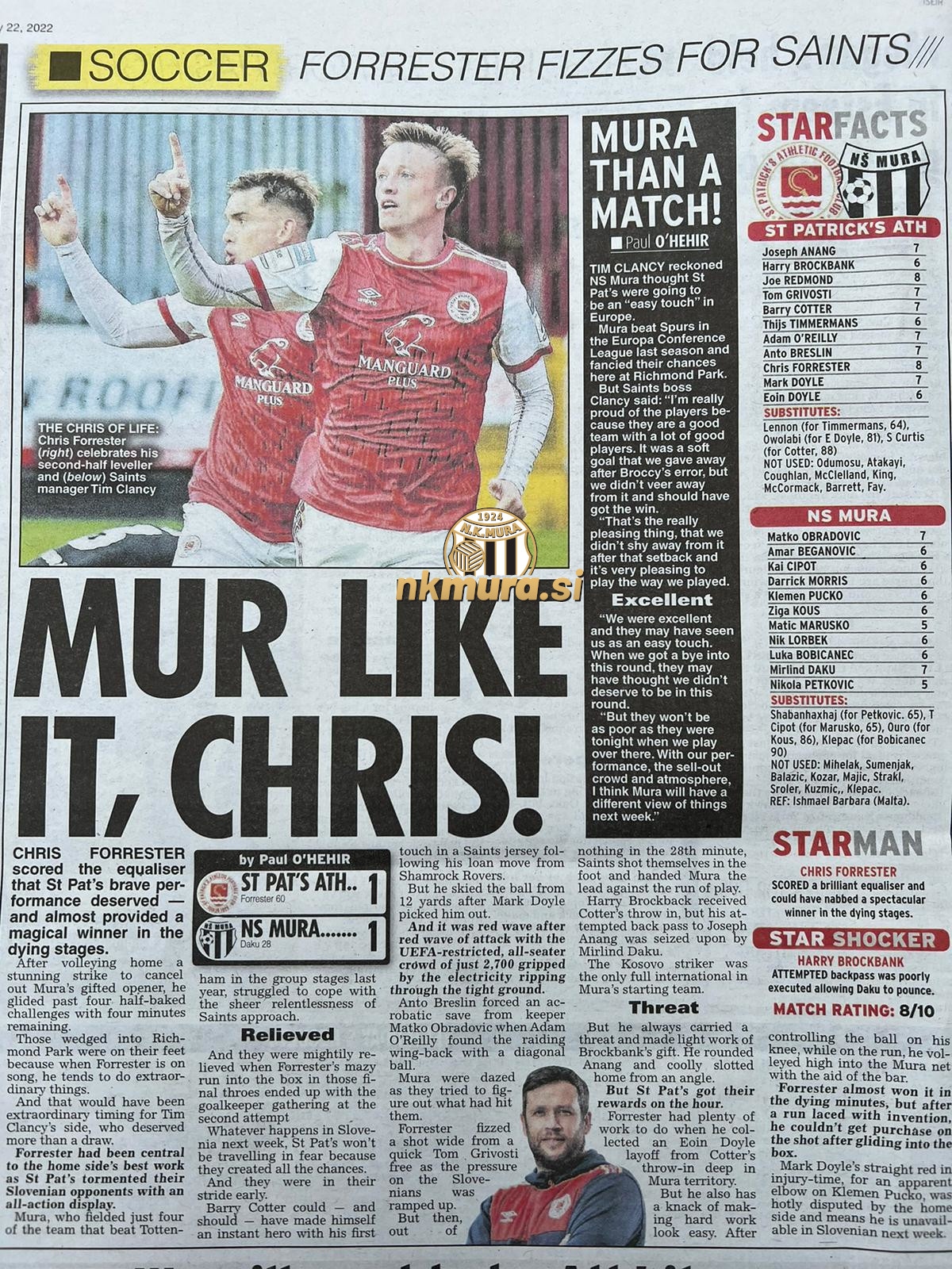 Dan po gostovanju v Dublinu smo pokukali v irske tiskane medije. O tekmi so največ zapisali v časniku Irish Daily Star, kjer se bohoti naslov "Mur like it, Chris". Največ pozornosti so seveda namenili strelcu izenačujočega zadetka, Chrisu Forresterju, ki je odigral eno najboljših tekem. Zadel je za izenačenje in ob koncu tekme skoraj premagal Obradovića. Pišejo, da se bodo St. Patrick's na povratno tekmo odpravili v dobrem razpoloženju in brez strahu, saj so pokazali, da si znajo ustvarjati priložnosti. Mediji prinašajo še izjavo trenerja Tima Clancyja, ki pravi, da bo Mura na povratni tekmi precej boljša oz. ne tako slaba kot je bila na prvi tekmi. "Mura ne bo tako slaba kot je bila nocoj. Bili smo odlični in sedaj so videli, da ne bomo lahek zalogaj. Zasluženo smo v 2. krogu."