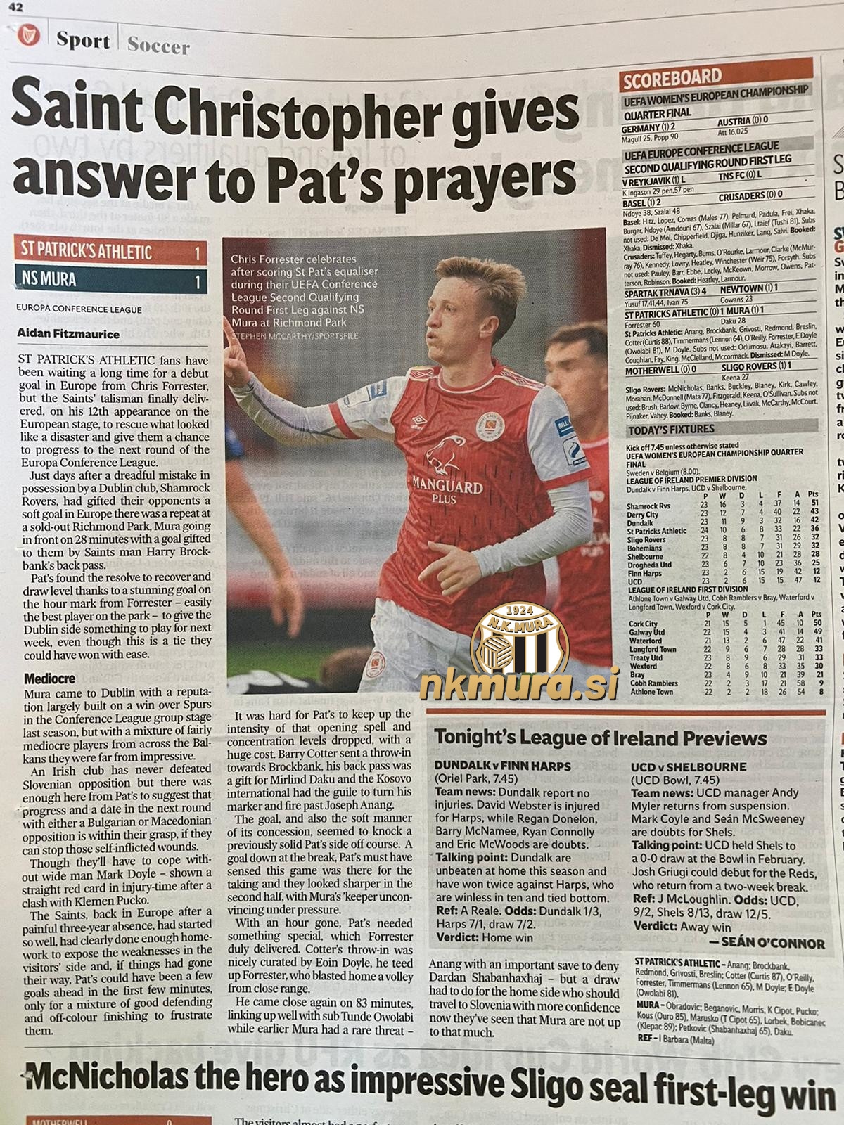 Irski mediji po tekmi z Muro. Avtorske pravice: nkmura.si Foto: Irish Independent, 22. julij 2022