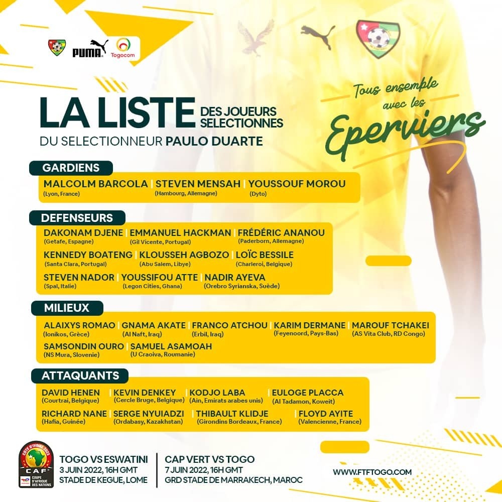 Vnovični vpoklic v reprezentanco Toga pa je dobil Samsindin Ouro. Izbranci Paula Duarteja se bodo pomerili z reprezentancama Esvatini in Zelenoortski otoki.
