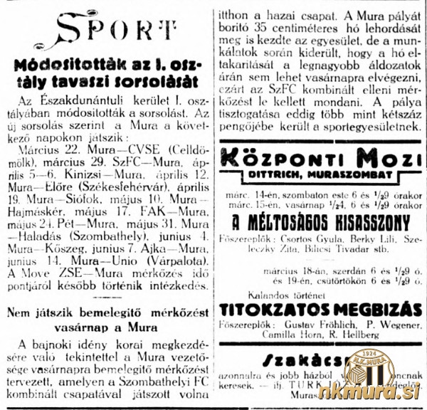 Vodstvo tekmovanja v I. razredu južne skupine severno podonavskega območja je določilo pare spomladanskega dela sezone 1941/42. Prvenstvo se nadaljuje 22. marca, ko bo Mura v Murski Soboti gostila Celldömölki.