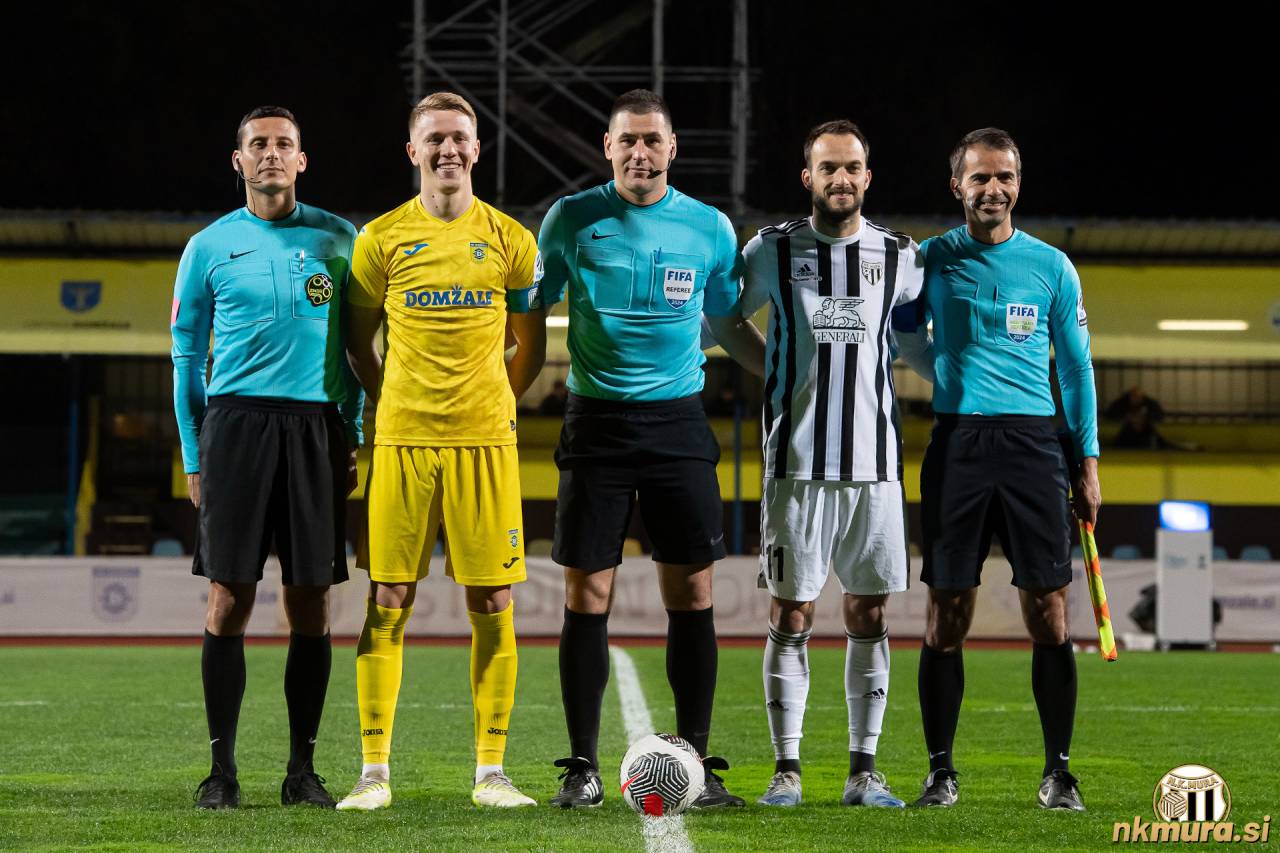 Skupinska fotografija kapetanov Markuša in Pucka s sodniško trojko. Avtorske pravice: nkmura.si Foto: Aleš Cipot/fotolens.si