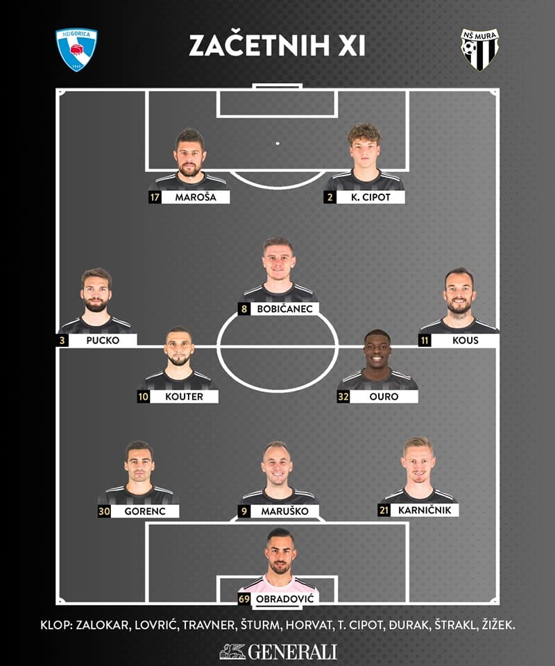 Mura je tekmo pričela v enaki postavi in postavitvi kot proti Olimpiji: Obradović - Gorenc, Maruško, Karničnik - Pucko (od 66. Šturm), Kouter (od 80. Horvat), Bobičanec (od 84. Đurak), Ouro, Kous - Maroša (od 80. Štrakl), K. Cipot (od 67. Žižek).