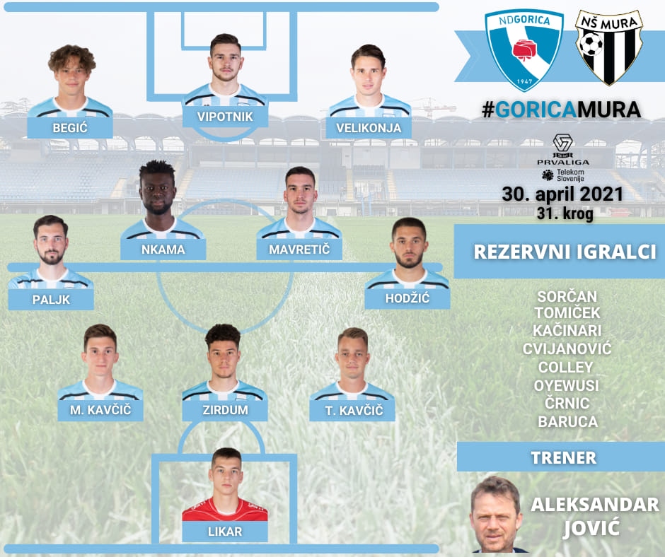 Gorica je tekmo pričela v ofenzivni postavitvi 3-4-3: Likar - M.Kavčič, Zirdum, T. Kavčič - Paljk (od 58. Oyewusi), Nkama (od 74. Baruca), Mavretič (od 58. Cvijanović), Hodžić - Begić (od 74. Kačinari), Vipotnik in Velikonja (od 58. Colley).