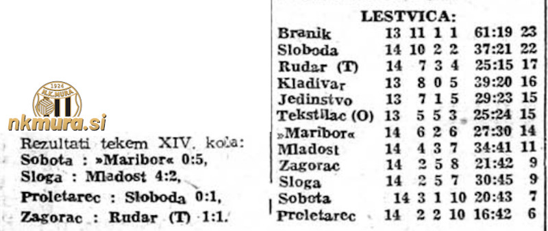 1. Branik 13 11 1 1 61:19 23 2. Sloboda 14 10 2 2 37:21 22 3. Rudar (T) 14 7 3 4 25:15 17 4. Kladivar 13 8 0 5 39:20 16 5. Jedinstvo 13 7 1 5 29:23 15 6. Tekstilac (O) 13 5 5 3 25:24 15 7. Maribor 14 6 2 6 27:30 14 8. Mladost 14 4 3 7 34:41 11 9. Zagorac 14 2 5 8 21:42 9 10.Sloga 14 2 5 7 30:45 9 11.Sobota 14 3 1 10 20:43 7 12.Proletarec 14 2 2 10 16:42 6