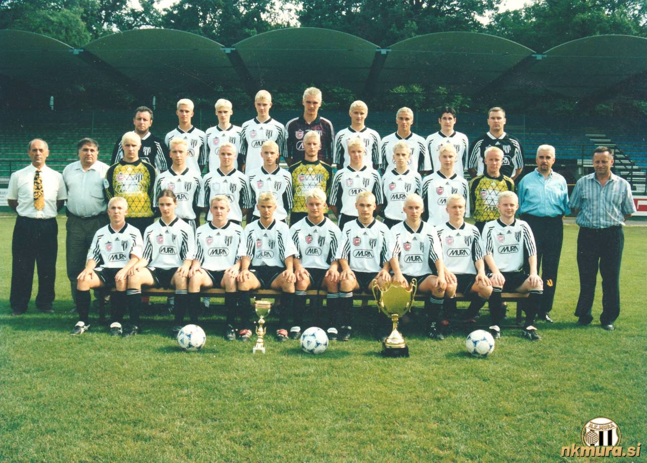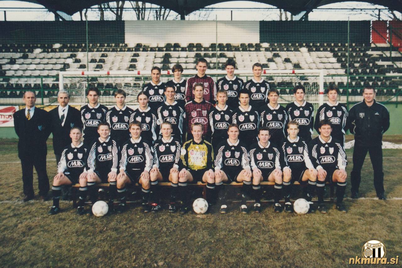 Državni mladinski prvaki in pokalni podprvaki v sezoni 1999/00. Ekipa se je v zimskem premoru dogovorila, da si pobarvajo lase v primeru osvojitve naslova prvaka. Zgornja vrsta: Marjan Matjašec (ekonom), Mihael Ivanič, Izidor Sabotin, Iztok Kerčmar, Aleš Luk, Dejan Šnurer, Mitja Mörec, Boštjan Bačič, Kristijan Benčina (kondicijski trener). Srednja vrsta: Slobodan Đurić (trener), Slavko Osterc (blagajnik), Tomaž Pleteršnik, Uroš Bezjak, Denis Žilavec, Aleš Šajt, Matjaž Vugrinec, Štefan Horvat, Daniel Faršang, Tomaž Celcar, Jožek Špilak, Dušan Faršang (tehnični vodja), Tugomir Frajman (predsednik kluba). Spodnja vrsta: Darko Tratnjek, Alan Šoštarič, Igor Preininger, Roman Gostan, Ludvik Časar, Leon Bači, Kristjan Šadl, Darjan Slavic, Simon Cotter. Avtorske pravice: nkmura.si Foto: arhiv NK Mura skozi čas