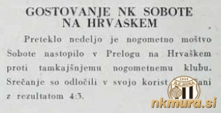 Nogometaši Sobote so v nedeljo 8. avgusta 1954 gostovali v Prelogu kjer so odigrali pripravljalno tekmo proti tamkajšnjemu klubu. Naši nogometaši so slavili s 3:4.