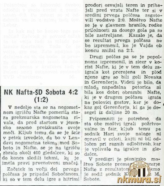 Začetek prvega polčasa je pripadel Soboti, ki je s hitrimi prodori osvajala prostor in prihajala pred vrata Nafte. Do sredine polčasa so Sobočani vodili z 0:2. Ko je že vse kazalo, da bo to tudi rezultat polčasa, so se Naftaši z zadetkom vrnili v igro. Pravo nasprotje je bil drugi polčas, ki je v celoti pripadel domačinom, ki so igrali kot prerojeni. Mlada napadalna petorica Sobote ni bila kos Naftini obrambi, ki je skoraj celotni drugi polčas igrala na polovici Sobote.