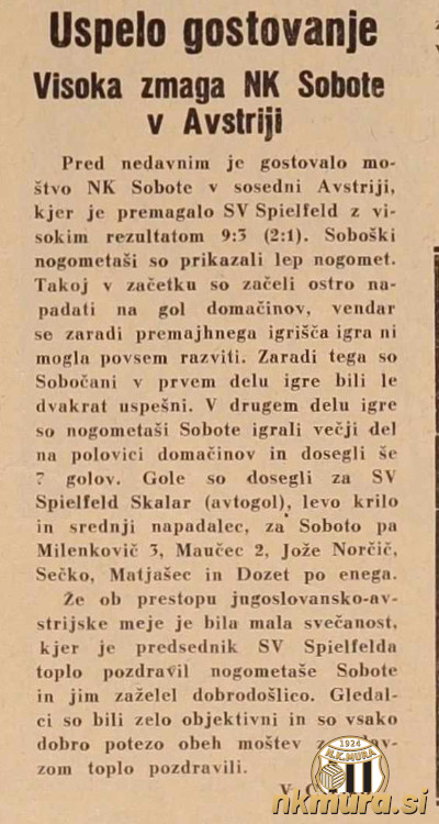 Soboški nogometaši so prikazali lep nogomet. Takoj v začetku so ostro napadli, vendar zaradi premajhnega igrišča niso mogli povsem razviti svoje igre. Kljub temu so dosegli dva zadetka. V drugem delu igre so nogometaši Sobote igrali večji del na polovici domačinov in dosegli še sedem zadetkov. Za Spielfeld so zadeli Skalar (avtogol), levo krilo in srednji napadalec. Za Soboto so bili uspešni Milenkovič (3), Maučec (2), Jože Norčič, Sečko, Matjašec in Dozet.