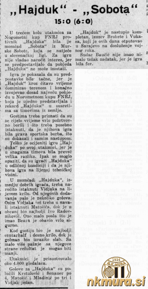 Nogometaši Sobote so v osmini finala pokala maršala Tita gostovali v Splitu, kjer so se pomerili z aktualnim državnim prvakom Jugoslavije, Hajdukom. Pred okrog 4000 gledalci so slavili Splitčani, ki so zmagali s 15:0 (6:0). Tekma je bila odigrana na stadionu Stari plac.