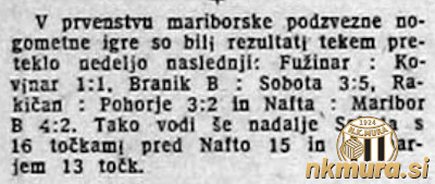 1. Sobota 10 8 0 2 52:14 16 2. Nafta 10 7 1 2 30:18 15 3. Kovinar MB 10 5 3 2 25:14 13 4. Branik B 10 5 1 4 38:29 11 5. Fužinar 10 3 1 6 19:29 7 6. Rakičan 10 3 1 6 10:36 7 7. Pohorje 10 3 0 7 22:43 6 8. Maribor B 10 2 1 7 15:28 5