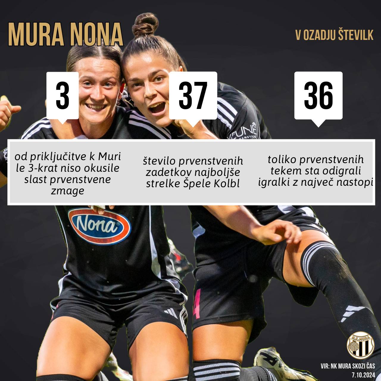 - Odkar ima Mura pod svojim okriljem žensko ekipo so naše nogometašice odigrale 36 prvenstvenih tekem. Le 3-krat se niso veselile zmage. Od tega so enkrat igrale neodločeno, dvakrat pa izgubile, obakrat z Olimpijo.