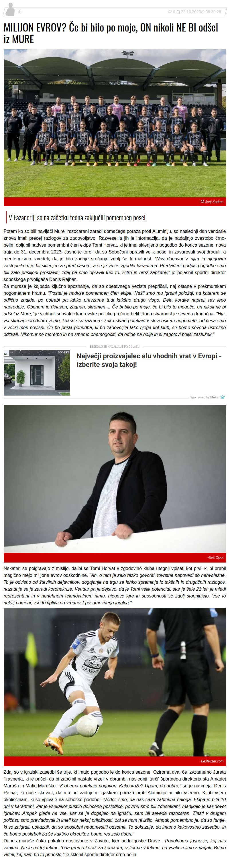 Športni direktor Mure, Denis Rajbar je spregovoril za osrednji slovenski športni časnik Ekipa. Govora je o podaljšanju pogodbe s Tomijem Horvatom, ter o Amadeju Maroši in Maticu Marušku, ki sta naslednja v vrsti za podajšanje pogodbe.