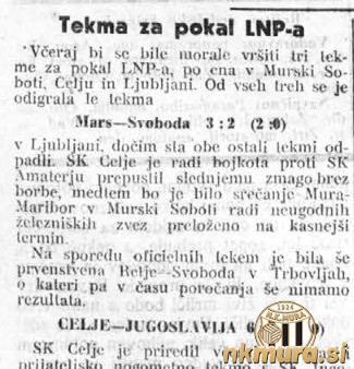 V 3. krogu pokala LNP bi se morala Mura 12. novembra 1939 v Murski Soboti pomeriti z I.SSK Mariborom. Zaradi neugodnih železniških zvez z Mursko Soboto je bila tekma preložena na poznejši termin.