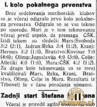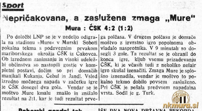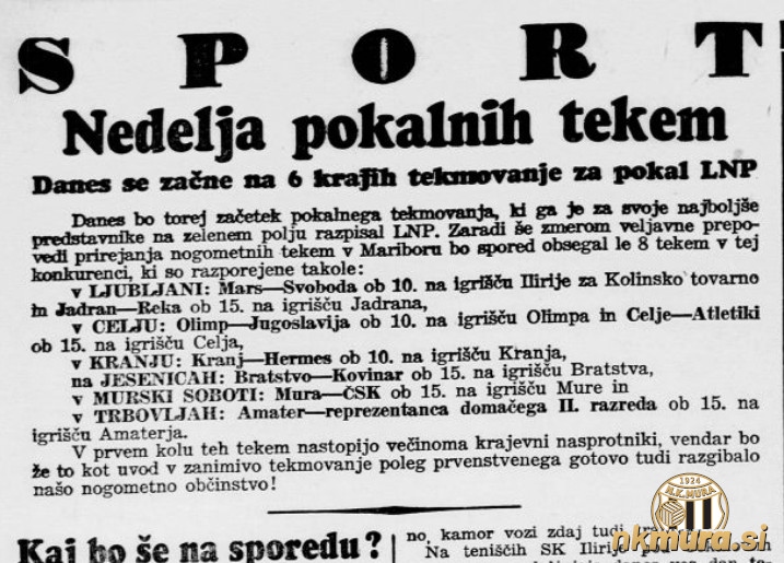 S sezoni 1938/1939 se je po dolgem času pričelo pokalno tekmovanje za pokal Ljubljanske nogometne podzveze (LNP). V prvem krogu je v Murski Soboti gostoval Čakovečki S.K., ki ga je Mura porazila s 4:2. Ob polčasu so gostje vodili z 1:2.