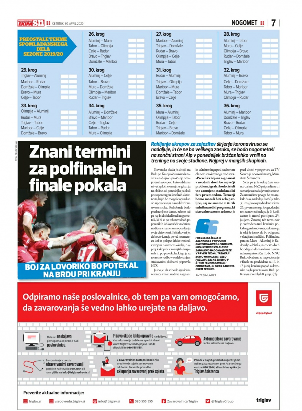Glede na to, da država počasi sprošča ukrepe za zajezitev koronavirusa, je za pričakovati, da se bodo igralci kmalu vrnili na igrišča. Ker bo ritem tekem zelo zgoščen (sreda, nedelja), se je NZS odločila in nekoliko spremenila format ter kraj igranja pokalnih tekem. Mura bi se v polfinalni tekmi morala dvakrat pomeriti z Aluminijem, vendar se bo igrala le ena tekma in to na nevtralnem igrišču brez gledalcev. Prizorišče bo Nacionalni nogometni center (NNC) Brdo. Posledično se tudi finale seli na nevtralno igrišče - s Fazanerije na Brdo.