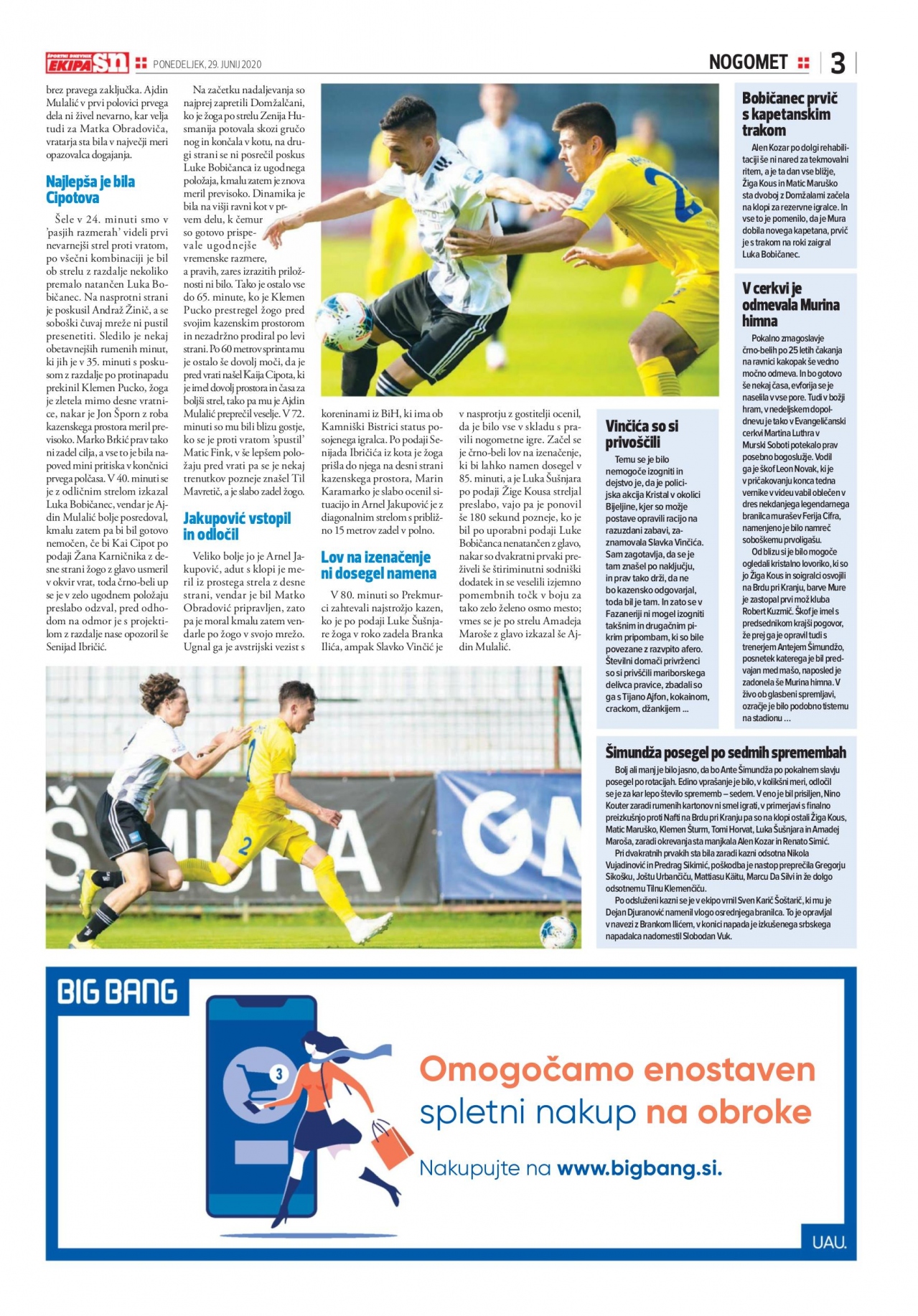 Ta je v 44. minuti zletela tudi čez Murin gol, potem ko je po strelu Senijada Ibričića Martin Karamarko z glavo preusmeril žogo od mreže. Tik pred koncem polčasa pa so imeli gosti, še eno priložnost v bližini gola je poskusil Slobodan Vuk preusmeriti žogo v mrežo, a je zgrešil cilj. Za malo ga je pri gostih, kjer ni bilo Marca Da Silve, Gregorja Sikoška, Jošta Urbančiča, Mattiasa Käita, Tilna Klemenčiča, Nikole Vujadinovića in Predraga Sikimića, tudi Andraž Žinič v 28. minuti.