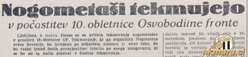 Nogometna zveza Slovenije se je odločila, da bo v počastitev 10. obletnice Osvobodilne fronte pripravila pokalno nogometno tekmovanje. Potekalo bo tako, da bo vsako izmed šestih poverjeništev izločilo enega zmagovalca, ki se bo nato uvrstil v nadaljnje tekmovanje.
