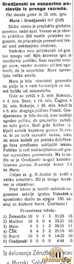 Mura je bila absolutni gospodar na igrišču in za razred boljša od nasprotnika. V 3. minuti je zadel Vladimir Kukanja, v 4. Drago Starc, v 14. Štefan Čagran, v 26. Vladimir Kukanja, v 39. Adolf Klojčnik in v 51. minuti Herman Flesch.