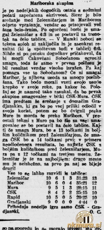 Do konca prvenstva so ostale še zaostale tekme Čakovečkega. Z njim bo igrala tudi Mura in sicer 28. novembra 1937 v Čakovcu. Mura se trenutno nahaja na 3. mestu prvenstvene razpredelnice, vendar je za pričakovati, da jo bo Čakovečki prehitel, saj mora odigrati tekmo z mestnim rivalom Građanskim. V izločilne boje, ki bodo spomladi 1938, vodijo prva tri mesta na lestvici in naključje je hotelo, da bosta o tem odločala Čakovečki in Mura na svoji zadnji tekmi. Če Mura zmaga v Čakovcu, bo imela 13 točk in bo zasedla prvo mesto na lestvici, saj je v medsebojnih tekmah boljša od Železničarja. Če Mura izvleče neodločen rezultat, bo z dvanajstimi točkami zasedla tretje mesto. V primeru poraza bo na koncu zasedla četrto mesto in se poslovila od nadaljnjega tekmovanja.