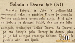Nogometaši Sobote so se v pripravah na spomladanski del sezone v sezoni 1957/58 pomerili s ptujsko Dravo. V Murski Soboti je bilo 6:3 (3:1) za Sobočane.